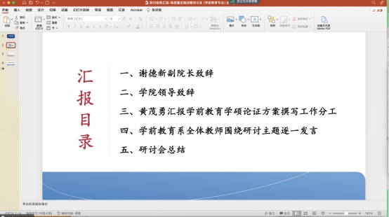 接下来,熊华军经理明确指出学前教育系要举数字大旗,穿巨身理论鞋,披双能(技能/师能)盔甲,走品牌之路,开辟0-6岁婴幼儿新赛道。另外,熊华军强调要积极组建团队,开展有组织的高水平科研。攻克重难点工作助推博士点建设。随后,系主任黄茂勇老师对学前教育学硕论证方案撰写工作进行详细分工。