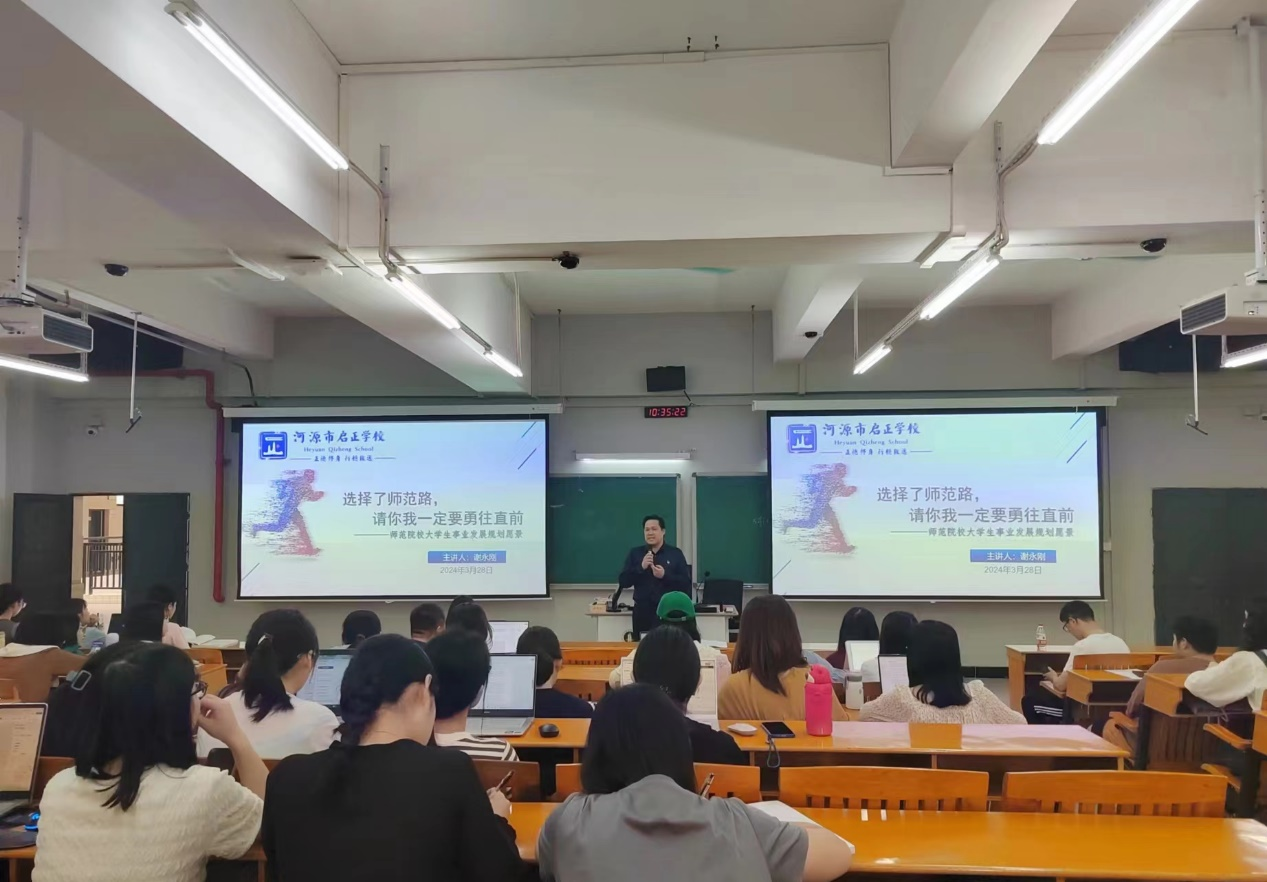 谢永刚董事长首先向同学们展示了启正公司发展的历程。接下来,谢董事长以身为例,风趣幽默地向同学们分享了求学岁月和从教征程。在讲述与师范相伴的求学岁月时,谢董事长勉励同学们,要严于律己、多向优秀人士取经;珍惜在校的时光,砥砺深耕,不断充实自我,成为对国家和社会有用的人。在分享从教征程中面临的困难与机遇时,谢董事长语重心长地说:“若临好机遇,必全力以赴”,期望同学们脚踏实地走好每一步。最后,谢董事长与师生现场交流互动,开拓了大家的视野和对专门教育的认识。