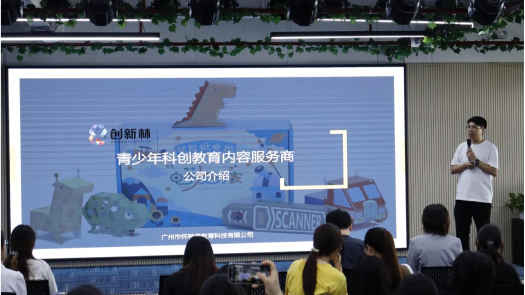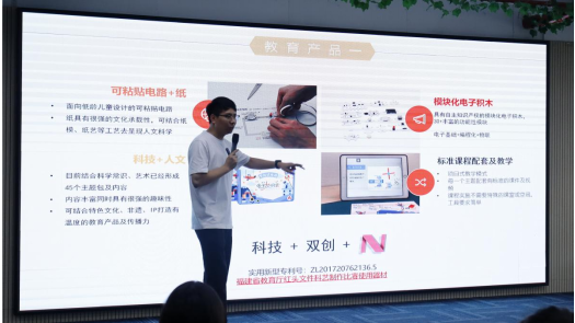 企业创始人陈柱城为师生介绍公司的业务范畴和基本情况,展示了企业自主研发的科创教育系列产品,如可粘贴电路、模块化电子积木、标准课程配套教学资源等,全方位地展现了公司在人工智能教育领域的深度探索与前沿实践,帮助同学们进一步了解人工智能教育企业的前沿发展,直观地感受到了该领域的发展动态与无限潜力。