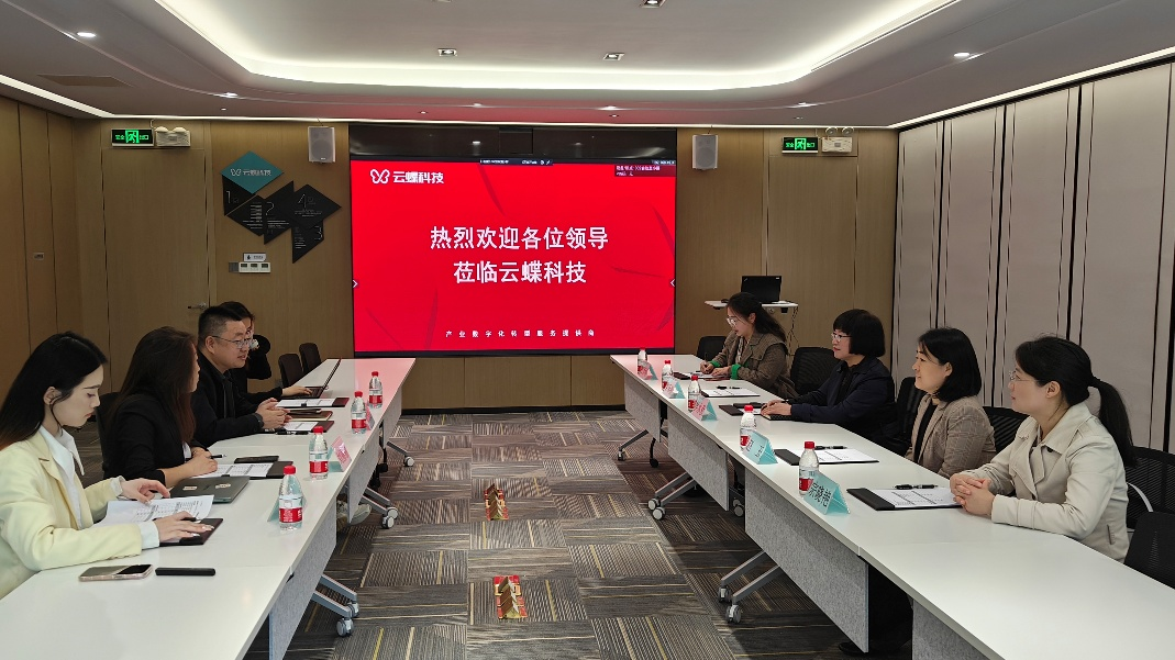副总裁刘丽丽首先带领大家参观了云蝶科技的展厅,详细介绍了公司的发展历程、核心业务及云蝶智脑、智慧纸笔课堂、教育大数据、自研大模型等拳头产品。随后,双方进行了座谈交流。吴水爱介绍了公司和教育技术学系的发展情况、人才培养模式及毕业生就业状况,并就拓宽员工实习与就业渠道、进一步加强产教融合、聘请产业导师、优化教育技术学人才培养方案、辅导员工竞赛、助力河源帮扶等议题进行深入讨论。云蝶科技总裁田雪松对公司的到访表示欢迎,表示公司愿意与公司在人才培养、产品研发、就业培训等方面加强合作。副总裁刘丽丽提出希望与高校共同设计实践课程,推动理论与实践的深度融合。
