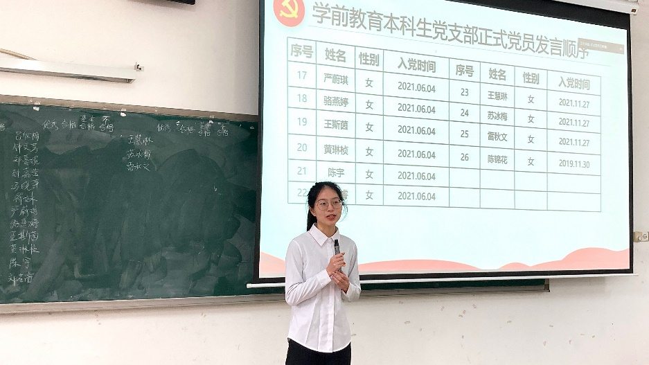 (图:学前教育本科生党支部副书记植葵森同志主持)