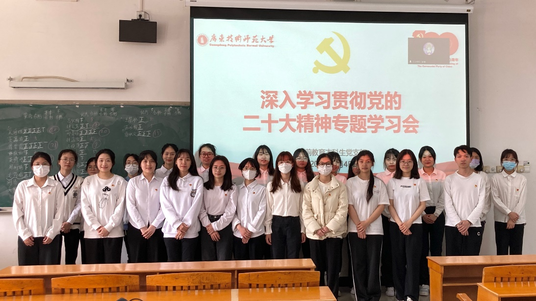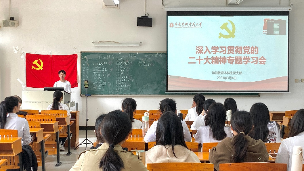 为进一步深入学习贯彻落实党的二十大精神,学前教育本科生党支部于2023年3月4日在三教207教室召开学习贯彻党的二十大精神专题学习会。会议由党支部副书记植葵森同志主持,全体党员参会。