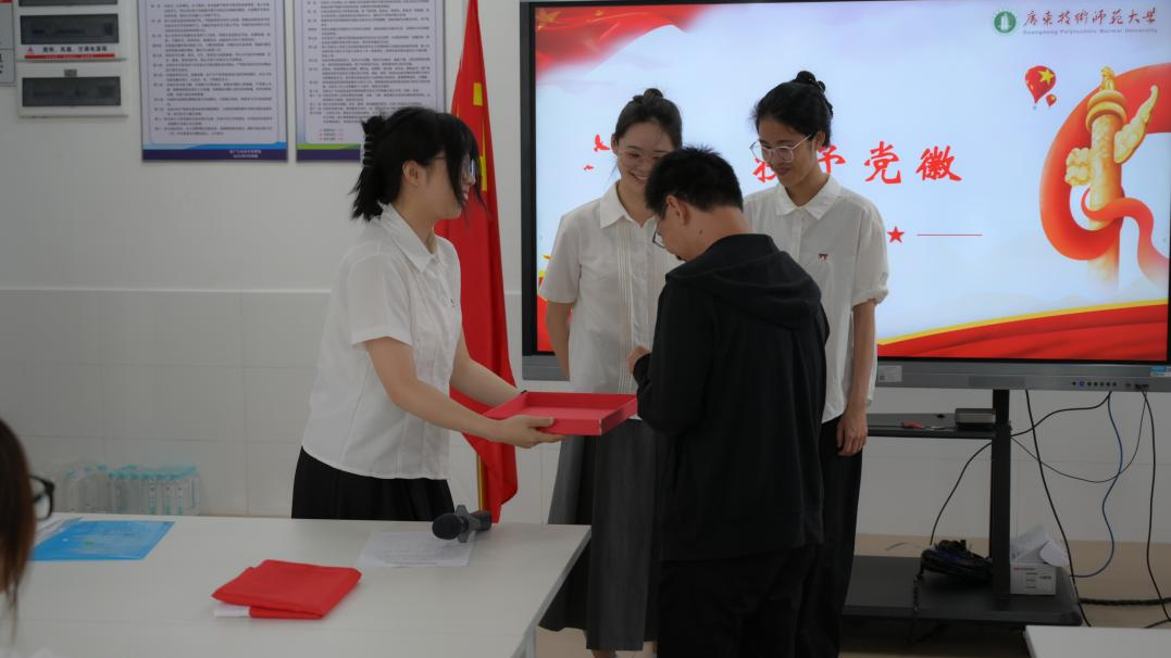 ▲黄石华老师为新党员佩戴党徽