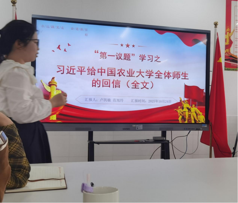 接着,会议组织全体党员与积极分子专题学习《习近平总书记给中国农业大学全体师生的回信》,旨在深入领会习近平总书记重要指示精神。副书记卢凯敏同志与入党积极分子范旭玲同志结合自身感悟作了交流发言。随后,大家围绕回信的核心要义、时代价值以及如何在实际工作中贯彻落实等问题进行了深入研讨。在学习中,梁爽书记强调,要深刻领会习近平总书记给中国农业大学全体师生的重要回信精神,牢记“为党育人、为国育才”使命,做到学思用贯通、知信行统一。张琳书记希望全体党员勇于“自找苦吃”,知行合一,厚植家国情怀,把个人理想融入国家发展大局。理论学习阶段,支部聚焦《习近平谈治国理政》第五卷中关于人才工作和教育强国战略的重要论述。通过集中学习,党员们不仅深化了理论理解,更将其内化为投身科研报国的的坚定信念和行动自觉。