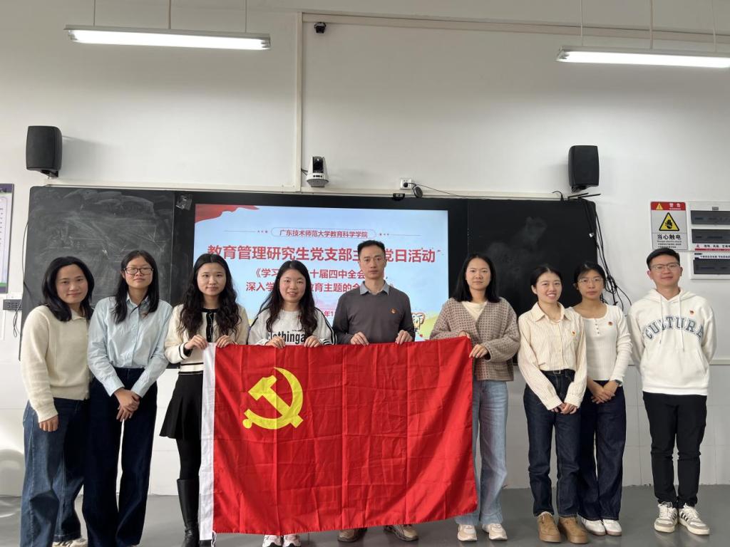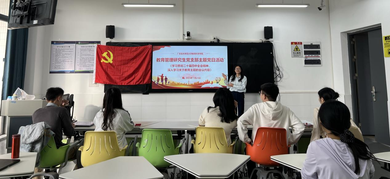 为深入学习贯彻习近平总书记视察广东重要讲话精神与党的二十届四中全会精神,推动理论学习与教育专业实践深度融合,切实强化支部党员及入党积极分子的责任担当与专业素养,1124日上午9点,教育管理研究生党支部在白云校区第二实训楼307教室成功举办11月主题党日活动。支部全体党员出席、入党积极分子积极参与,活动教育管理研究生党支部副书记卢凯敏同志主持,通过第一议题领学、主题研讨交流、实践经验分享三个环节,实现思想淬炼与能力提升的双向赋能。
