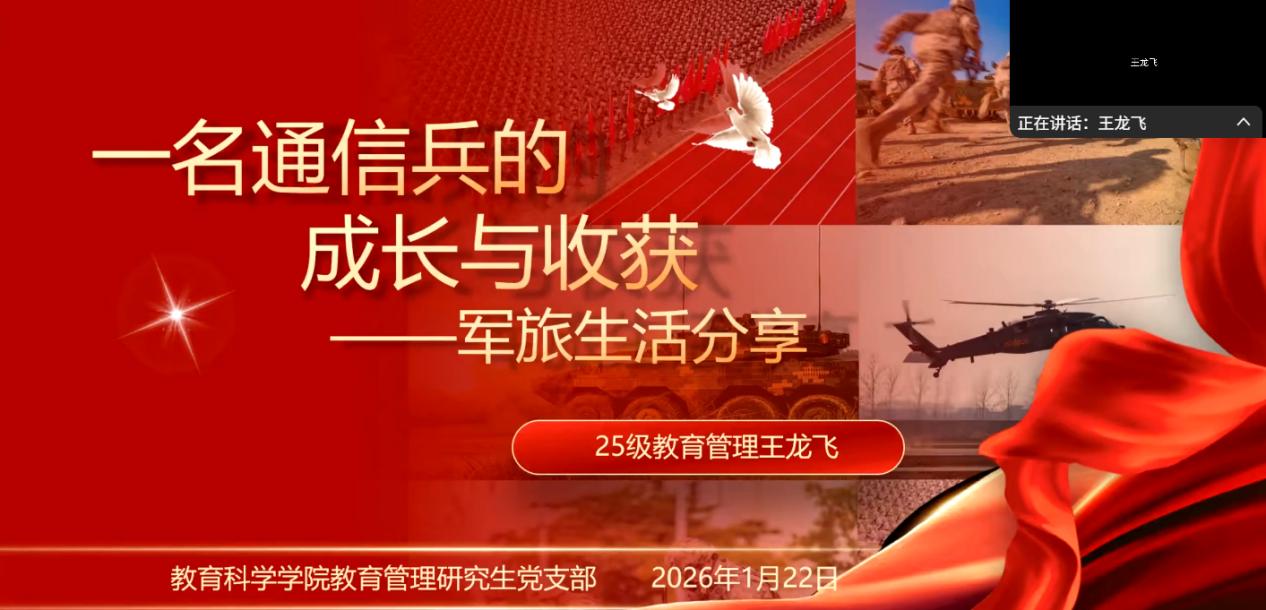 为深入学习贯彻习近平总书记新年贺词精神,强化党员及入党积极分子的使命担当,1月22日,教育管理研究生党支部以线上形式举办主题党日活动。活动融合第一议题学习与军旅生活分享两大核心环节,通过理论滋养与实践感悟的深度碰撞,为全体党员、预备党员及部分入党积极分子带来了一场深刻的思想淬炼与精神洗礼。会议由支部副书记卢凯敏同志主持