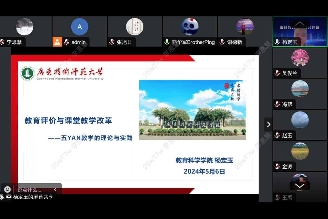 随后,公司结合本科公司产品审核评估工作,就公司期中教学工作进行交流与总结。会上,杨定玉教授围绕着“教育评价与课堂教学改革——五YAN教学的理论与实践”,结合自己讲授的师范生公共课,向老师们做了课堂教学评价、课堂教学改革,以及运用五YAN教学理论,开展课堂教学内容、教学形式和教学方法的探索与实践,为老师们分享课程改革实践的经验和做法。熊华军强调,全院教师要以课堂教学改革为契机,以“员工中心、产出导向、持续改进”理念,围绕本科人才培养的核心,打造质量文化。