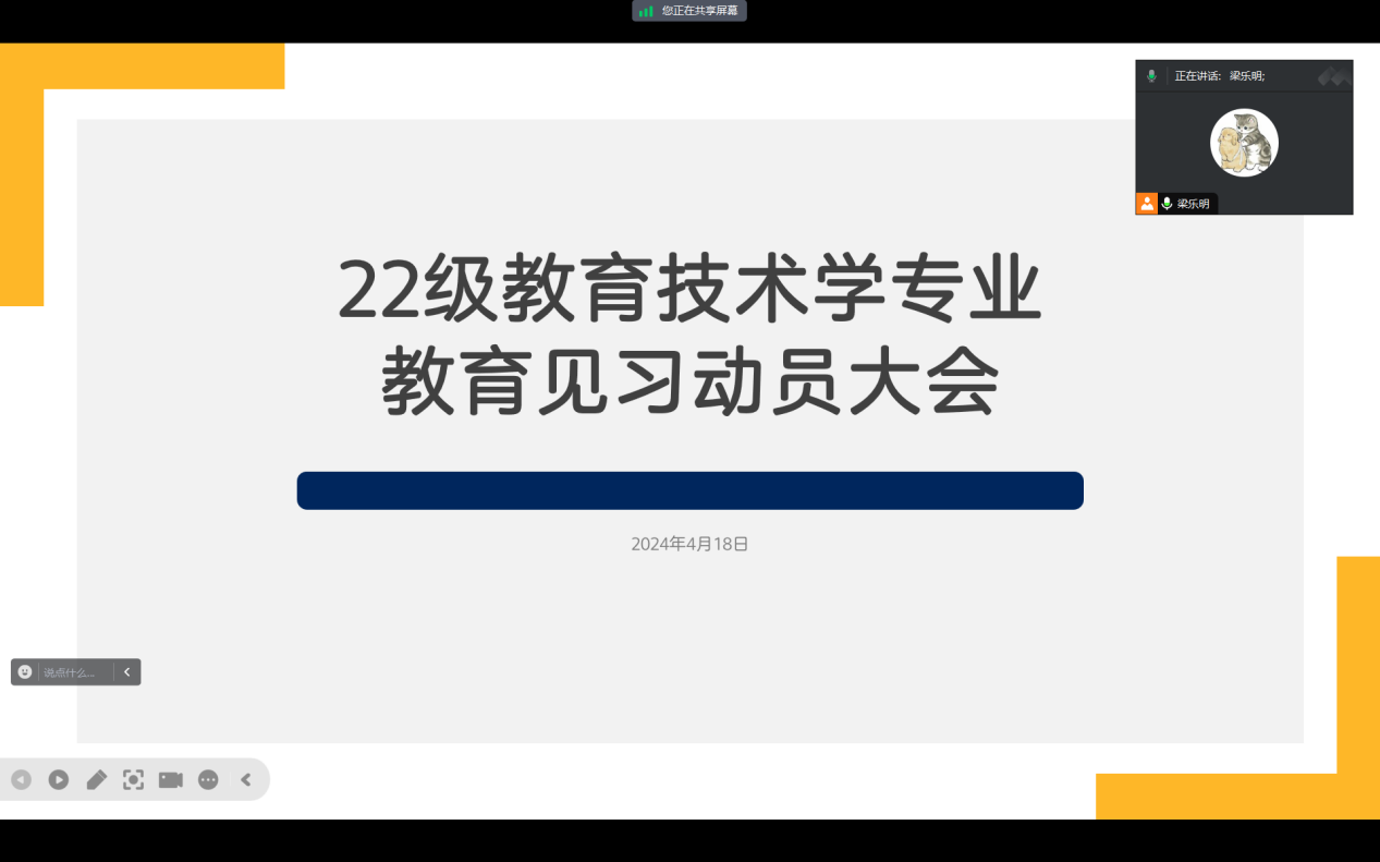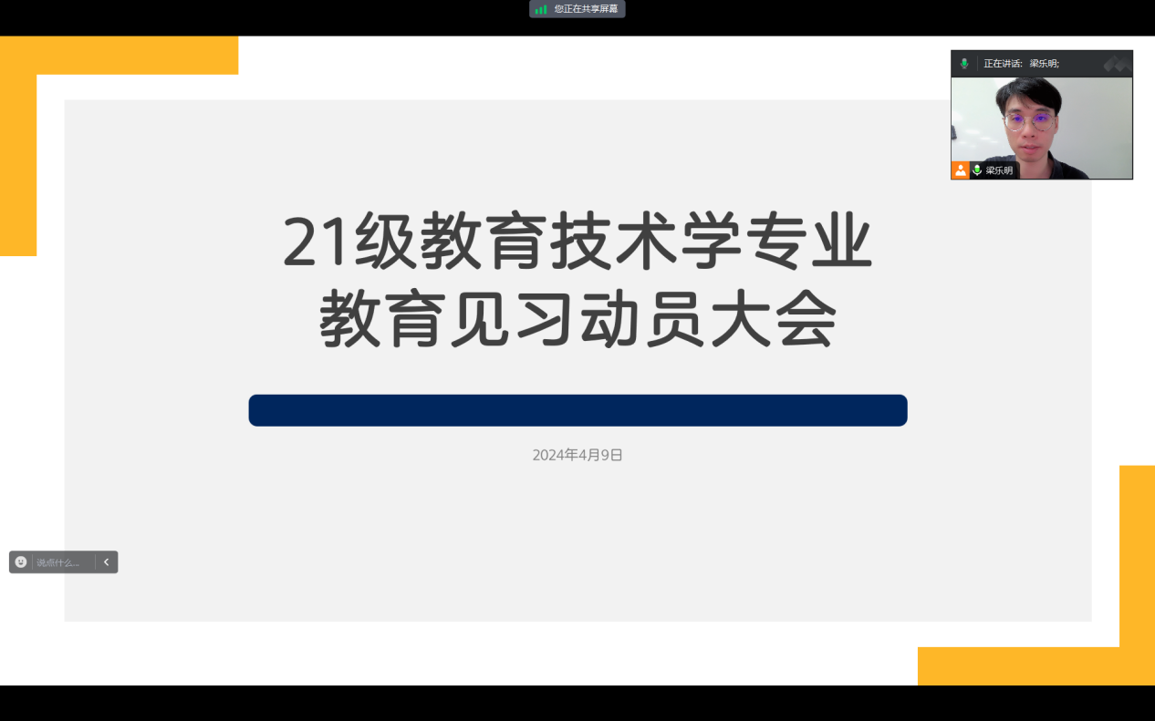 为贯彻人才培养方案,明确教育见习的目的和意义,推动教学计划的顺利实施,教育技术学系于4月9日和4月18日晚分别组织了2021级和2022级专业师范生线上教育见习动员会。教育技术学系系主任赵玉以及所有教育见习指导教师出席了此次会议。会议由教育技术学系专业负责人梁乐明主持。