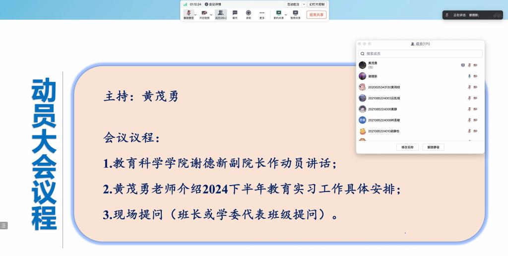 2024年6月28日星期五下午,学前教育系举行了2021级师范生教育实习动员大会。参会人员包括副经理谢德新、专业负责人徐韵莹、教育实习指导老师和2021级全体同学。会议由学前教育系主任黄茂勇主持。