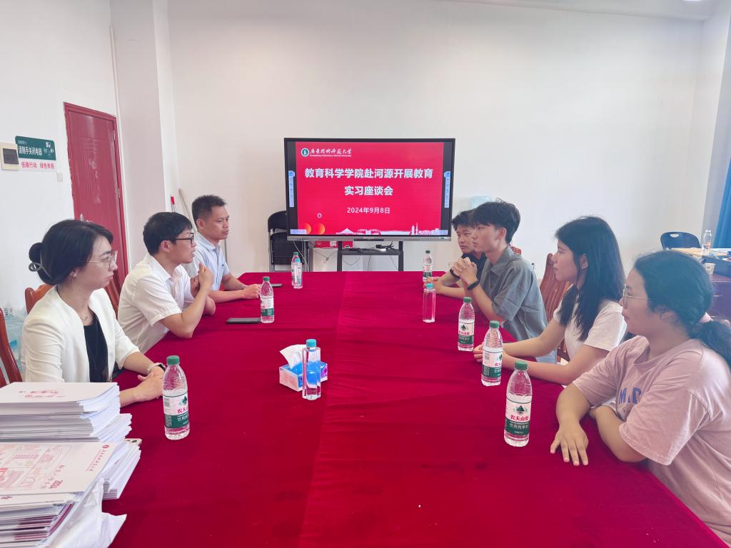 为深化教育实习实践,提升师范生专业技能,了解员工在实习基地的基本情况,bevitor伟德国际1946于9月8日上午赴河源市开展教育实习座谈会。bevitor伟德国际1946经理熊华军、副书记吴水爱、副经理谢德新、骆明丹老师、以及梁欢、宋米堃,唐洁,胡萍妹等4位实习生参加座谈会。会议由熊华军经理主持。