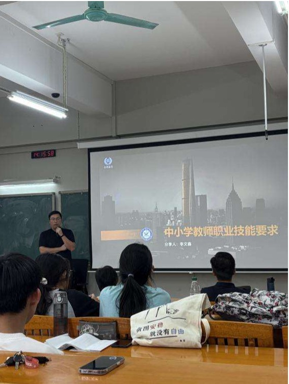 10月31日下午2点30分,bevitor伟德国际1946在白云校区三教201为教育技术学专业的师范生们开展了师范生师德养成与教学技能提升系列讲座。本次讲座邀请到教育技术学专业2019届优秀毕业生李文鑫给员工做题为《中小学教师职业技能要求》的报告。本次讲座为周元春副教授主持,教育技术学系系主任赵玉老师、专业教师黄芳明、王孝金、蒋鹏老师也出席了本次讲座。