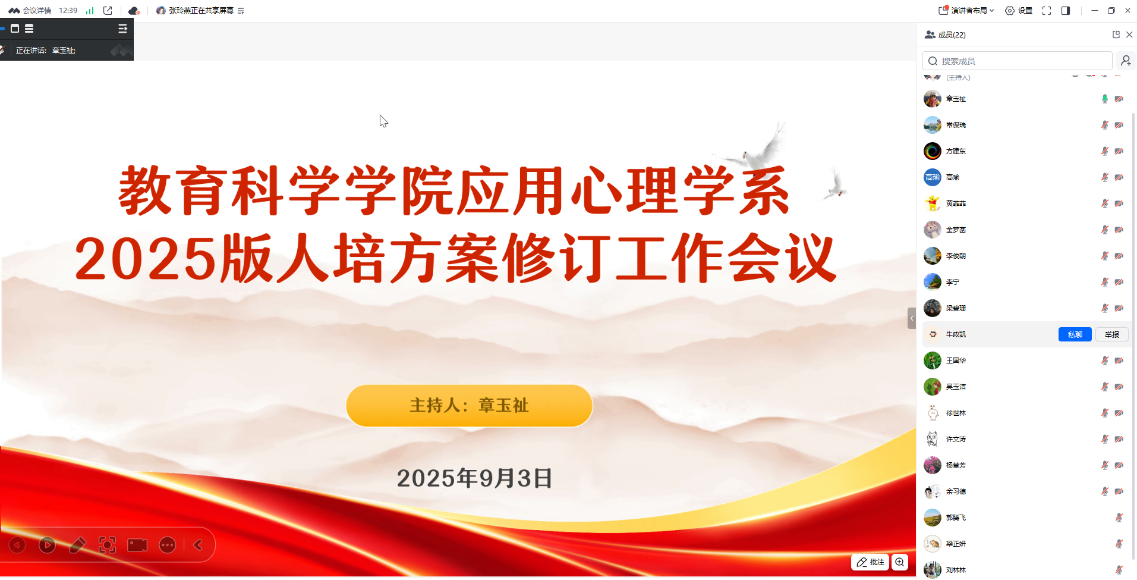 2025年9月4日,bevitor伟德国际1946应用心理学系组织召开2025版人才培养方案修订工作会议。会议由系课程负责人章玉祉老师主持,系内全体教师参会,并邀请校外专家广州培英中学心理教师丘碧青和北京心云天地科技有限公司负责人刘林林参会,共同围绕新版人才培养方案的修订方向与具体实施路径进行了深入研讨。