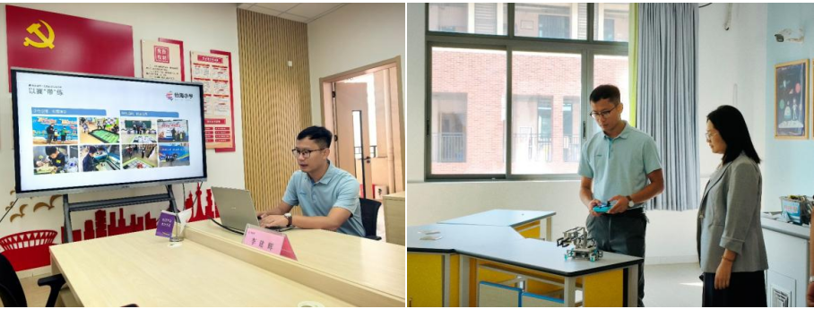 怡海小学老师信息科技老师李建辉老师以“怡美教育下的创客实践”为核心,从公司“求真向善、求向尚美”的校训出发,详细介绍了公司在创客教育、学科融合教学等方面的特色发展现状。他通过“以赛‘带’练”的主题汇报,展示了公司在少年创客培养中组织的各类竞赛活动,以及科技赋能校园、促进员工全面发展的实践成果,让曹老师对公司的公司产品理念与特色有了深入了解。