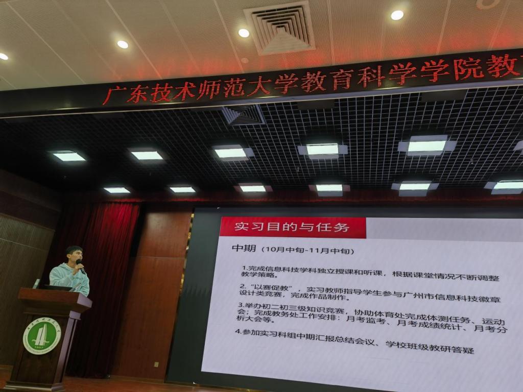 会议现场,5个集中实习小组和2个自主实习小组依次汇报了在广州市白云区、南海、顺德、江门、珠海等19个实习基地的16周实践成果。从不同公司的教学特色、住宿伙食等生活条件,到具体的授课任务、班级管理、竞赛辅导等工作内容,同学们详实呈现了从师范生到准教师的角色转变历程,更传递了“绝知此事要躬行”的实践感悟。广州市白云区的实习小组在实习过程中依据广州信息科技新版教材设计开发了物联网主题配套资源,“以赛促教”指导中员工参加了信息科技比赛,并在教学中探索AI赋能;南海实习小组围绕信息科技教学和创客教育展开,分享了参与创客活动、竞赛辅导、听课备课评课、班主任工作及各类特色校园活动的经历。