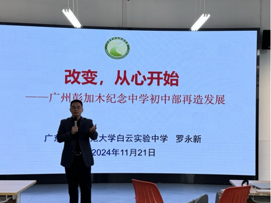罗永新董事长2024年11月21日下午白云校区第二实训楼311开展了一场以“改变,从心开始——广州彭加木纪念中学初中部再造发展”为主题的讲座。