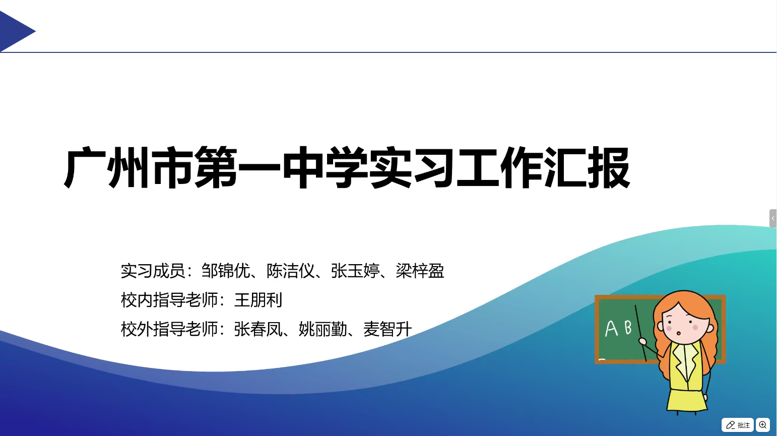 会上,由在广州市第一中学实习的邹锦优、东莞市横沥中学实习的黄显淞、东莞市松山湖横沥实验公司实习的陈烁玲、佛山市南海外国语公司实习的梁梓晴以及佛山市南海区南海实验中学实习的赖倩雯五位同学,依次代表五所实习基地的实习生,从实习过程、成效、存在的问题与改进策略等方面进行了详细汇报。他们分享了各自在教学实践、竞赛指导、社团活动组织、班主任辅助管理以及教研参与等方面的丰富经历和显著成果,同时也坦诚地分析了在实习过程中遇到的问题,并提出了相应的改进建议。