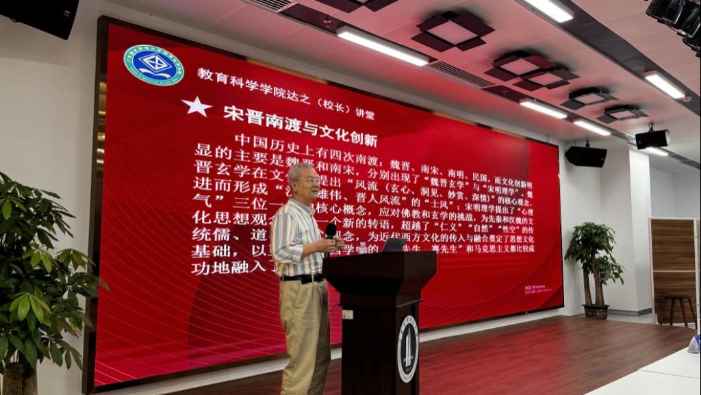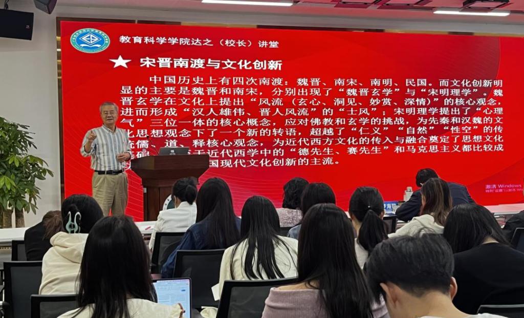 讲座中,单教授全程未使用讲稿,始终站立授课,以“晋宋南渡与文化创新”为核心脉络,凭借跨学科视角旁征博引,娓娓道来。他系统梳理了中国历史上四次重大南渡事件——晋人南渡、宋人南渡、南明南渡及民国时期高校与政府南渡,并指出晋宋南渡是其中最具文化创新价值的两次,深刻影响了后世思想与社会形态。