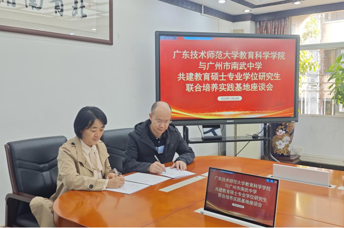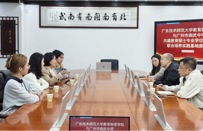 为深化校际公司产品交流,助力教育硕士将理论知识与教育实践深度融合,2025年11月24日,赵玉教授带领24级现代教育技术研究生前往广州市南武中学开启为期一个月的教育见习活动。南武中学副董事长黄赛飞、信息科技科长陈韶光、广东省科技教育名师工作室主持人许月媚等领导老师出席座谈会,并举行了研究生联合培养实践基地签约仪式,为此次见习活动拉开了圆满的序幕。